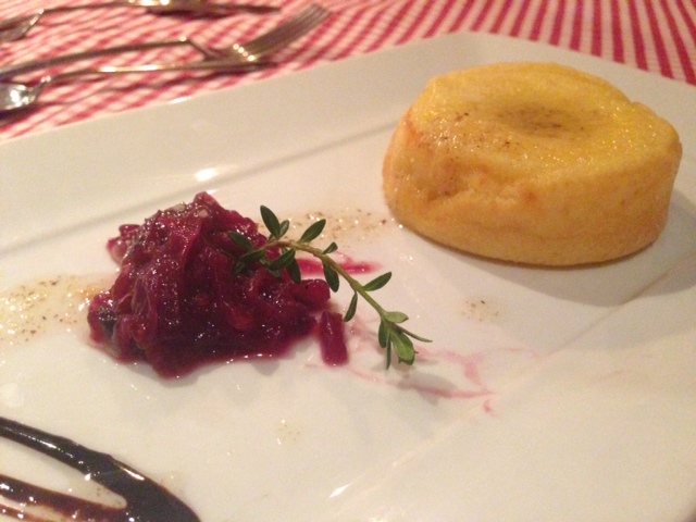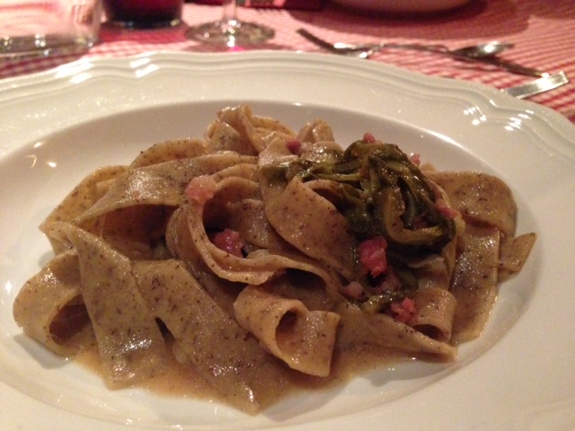 Un po’ di relax e una doccia ci fanno tornare l’acquolina in bocca. Ho prenotato in un altro luogo a me familiare. E’ un posto dove amo portare gli amici che vengono per la prima volta a Pinzolo. Casa al Campo. E’ un agriturismo gestito da una famiglia del posto. Loro sono carinissimi e cucinano esattamente alla loro maniera: adorabile. Il menù è una degustazione nella quale è possibile scegliere il primo (tra una scelta di tre diverse proposte) e il dolce (altrettante). Il resto è fisso ma ne vale la pena. Passiamo una serata tra chicchere e allegria. Mangiamo affettati e formaggi di loro produzione con una composta di zucca e uno sformatino di grana con marmellata di cipolle. Proseguiamo con tagliatelle di grano saraceno con salsiccia e radicchio dell’orso e ravioli ripieni di formaggio locale e conditi con erette di campo. Poi ancora a seguire un assaggio di arrosto e una piccola salsiccia adagiati su un po’ di polenta di Storo. Al dolce sono veramente piena nonostante le rassicurazioni iniziali della proprietaria che , raccontando il menù ai miei commensali, ha garantito che saremmo arrivati alla fine senza fatica viste le porzioni contenute (io sono già pienissima). Rinuncio ad un tortino al cioccolato, ad una crostata di mele cotogne e ad un semifreddo e mi concedo una granita con i lamponi raccolti durante l’estate e zenzero. Divina!! Ottima scelta.