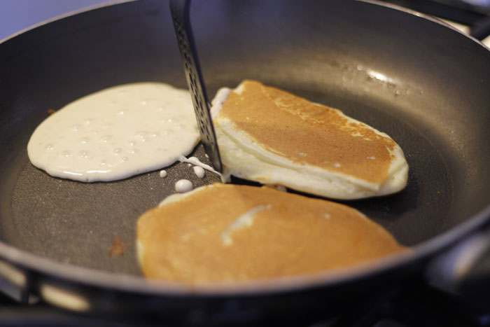 Sto per scrivere di un argomento che mi sta molto a cuore e ne sono molto felice. L’ho già detto e molti di voi lo sanno già, perché è una di quelle cose che non mi stancherò mai di sostenere. Noi italiani amiamo la buona tavola, la cucina in ogni sua sfumatura ma facciamo poco colazione insieme, sopratutto a casa. Per molti far colazione a casa vuol dire un tè, un caffè o un latte veloce con biscotti industriali. Vorrei essere quindi una delle voci fuori dal coro che predilige la colazione fatta in compagnia, con calma e mangiando cose buone. Capisco bene che in settimana non sia molto fattibile fare colazione in mezzo agli amici ma non è veramente necessario rinunciare a molto per farlo per bene. Basta uno yogurt con frutta fresca e una fetta biscottata con marmellata, per rendere migliore ogni mattina. Ci vogliono veramente 5 minuti in più del normale e questi pochi istanti, secondo me, valgono molto più del sacrificio che richiedono. Nel week end, invece, la colazione dovrebbe essere un rito da assaporare con lentezza, con le persone che amiamo e godendo di cibo cucinato con calma. Ho imparato tutto questo sulla mia pelle. Viaggiando e ospitando amici provenienti dall’estero ho capito come si faccia colazione in modo differente in paesi anche così lontani dalla nostra meravigliosa tradizione gastronomica. E allora perché noi dobbiamo accontentarci di ingerire un cappuccino e una brioche in tre minuti in piedi al bancone di un bar? Con tutto il rispetto per ogni abitudine, penso che sedendo qualche minuto anche al bar (se non abbiamo voglia di preparare a casa) saremmo meno frettolosi, ci prenderemmo cura di noi! Che sia settimana o weekend sulla mia tavola al mattino non manca mai il succo di limone, ( https://cookingsullenuvole.com/2014/04/03/per-perdermi-di-nuovo/) futta fresca o cereali , tè o caffè, fette biscottate o pane caldo con marmellata. Ancora addormentata preparo la colazione. Ci vogliono pochi minuti, ma posso garantire che la giornata inizia in modo diverso. C’è tempo per dormire ma il momento speciale della colazione tutta per voi non ha prezzo, parola mia (e di tutti coloro i quali sono abituati a venire a casa mia per le famose colazioni del weekend)!! Per questo vi svelerò la ricetta dei pancakes che preferisco. E’ una ricetta sperimentata. E’ frutto di alcune prove attingendo da diversi libri e da consigli preziosi di amici. Ma la versione definitiva è tutta mia.