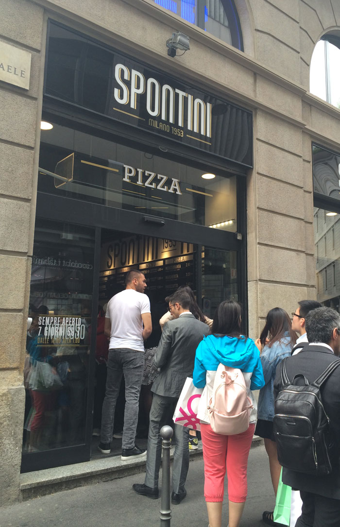 Ore 13:10 schivando turisti, fannulloni, modelle e manager incravattati, arriviamo davanti a Spontini. Fila che sembra immensa, arriva fino a fuori, in strada.