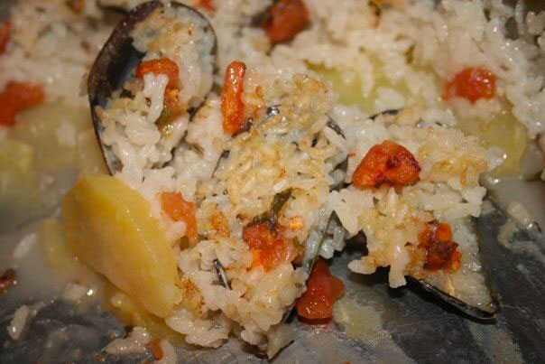Ingredienti: 1kg di riso (che non scuoce), 2 kg di cozze,3 patate di media misura, sale e pepe q.b., 1 lt d’acqua tiepida salata, prezzemolo, 1 scatola di pelati a pezzetti, olio extravergine d’oliva.