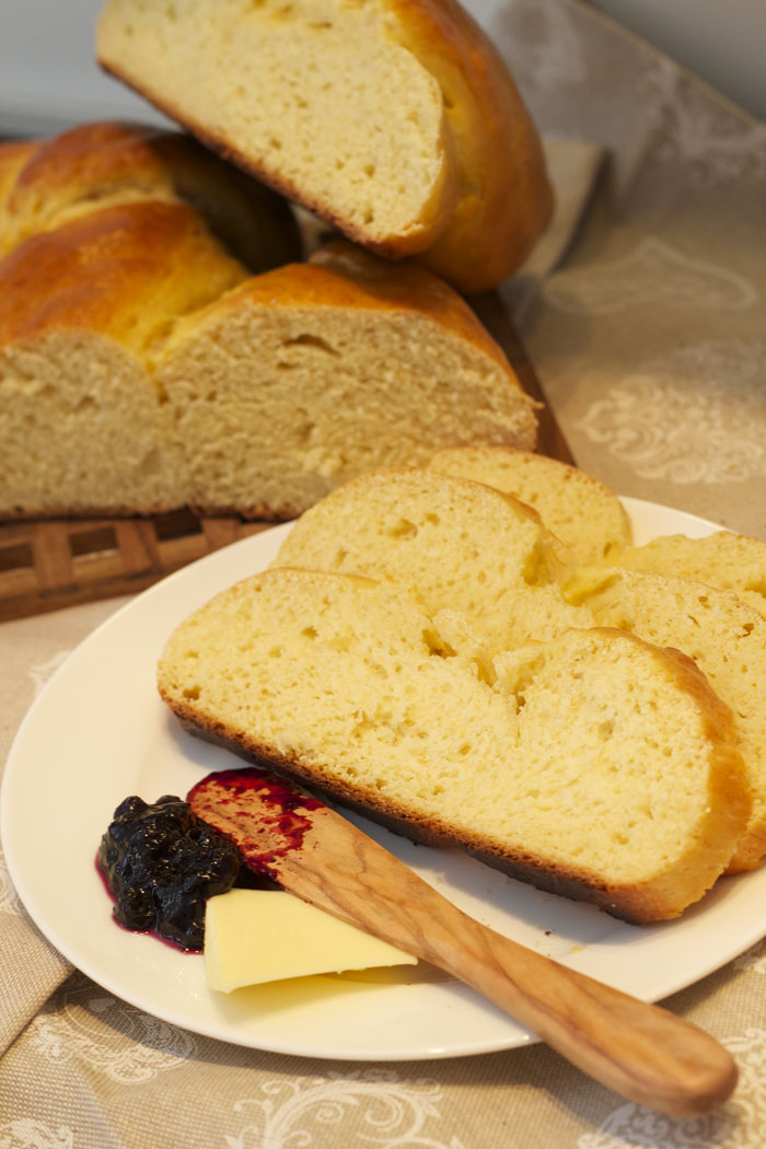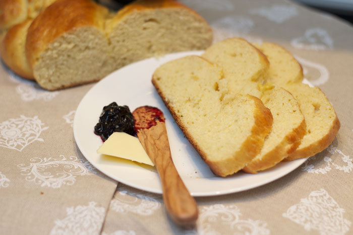 Procedimento: scaldare leggermente il latte. Mettere il lievito nel latte e mescolare leggermente. Impastare tutti gli ingredienti fino ad ottenere un composto morbido che non si appiccichi. Lasciare lievitare al meno un’ora. Trascorso questo tempo dividere l’impasto in tre parti e allungare fino ad ottenere tre cilindri di egual misura. Intrecciare tra loro i cilindri. Lasciare lievitare ancora 30 minuti. Spennellare con un uovo sbattuto la treccia ed infornare a 200° per 30 minuti.