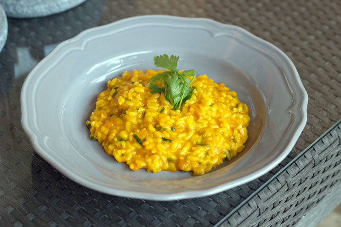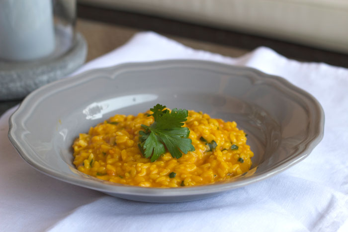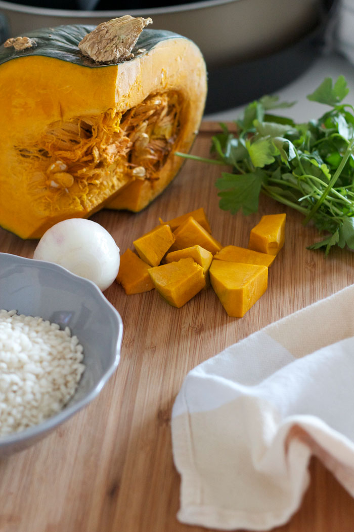 Ingredienti: riso carnaroli, zucca mantovana, sedano, carota, cipolla, parmigiano, prezzemolo, sale, olio evo, burro.