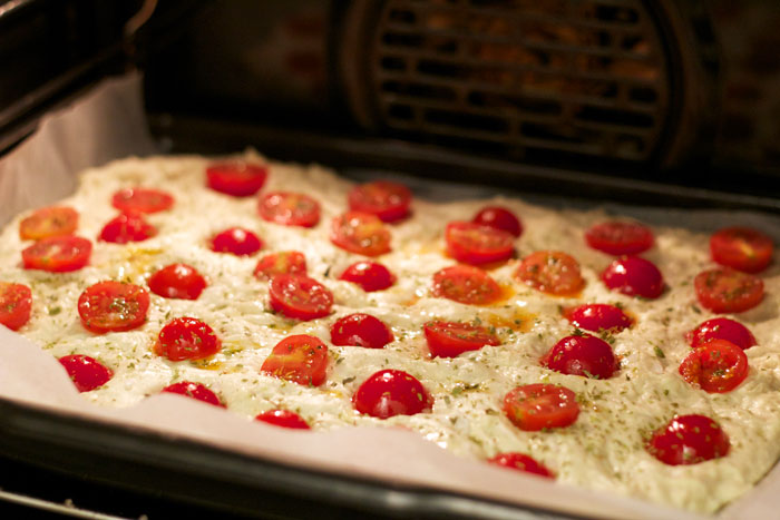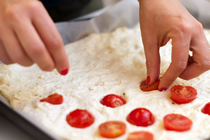 Ci sono momenti dell’anno dove, se potessi, userei solo il forno. Sono un po’ arrabbiata con il mio, di recente. Ha deciso di destabilizzarmi e mi confondo un pochino sui tempi di cottura. Alla fine i rapporti dove c’è confronto mi hanno sempre resa curiosa e così accade con il mio forno. Abbiamo un rapporto conflittuale; c’è amore e odio e non credo esista ricetta migliore per sfidarsi ogni giorno. Adeguandoci alla frenesia del mondo moderno, dopo il ponte dei morti, dopo la tanto amata (sopratutto dai bambini, ma non solo) notte di halloween, si svolta subito verso il periodo natalizio. Cominciano a comparire lucine, vetrine dei negozi, offerte di regali, tutto in pieno stile natalizio. Così che questa festa duri per quasi due mesi. Io vado un po’ cauta in tutta questa corsa. Sono cresciuta facendo l’albero durante il ponte di S. Ambrogio (da milanese vera) e tutto questo anticipo degli ultimi anni contribuisce a sgretolare le mie certezze (come il mio caro amico forno) che, di recente, paiono vacillare di tanto in tanto. Però, proprio in questo periodo, comincio ad avere voglia di confortevoli paste gratinate, di prodotti lievitati, di soffici torte con le mele e di biscotti al sapore di ginger e cannella. Si vede che, poi, in realtà, anche io mi faccio travolgere in fretta da tutta questa atmosfera e immagino come preparare i regali “mangerecci” rigorosamente home made, a come comporre i cestini con le marmellate e le conserve preparate d’estate e come rendere speciali pacchetti e decorazioni. Ecco solo parlandone, mi è venuta voglia di Natale. Per oggi suggerisco una bella focaccia con i pomodorini. La ricetta mi è stata data da un’amica che ha appena acquistato il Bimby e si diletta in ogni tipo di preprazione. Io, però, perchè sia una ricetta per tutti, vi lascio la mia versione che può essere preparata anche senza l’uso di elettrodomestici.