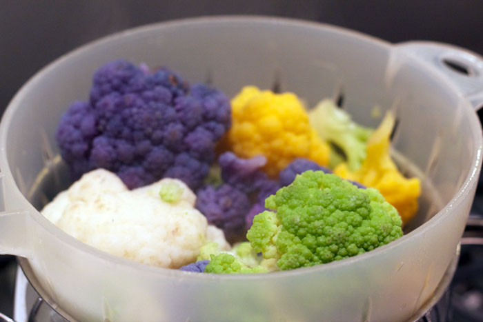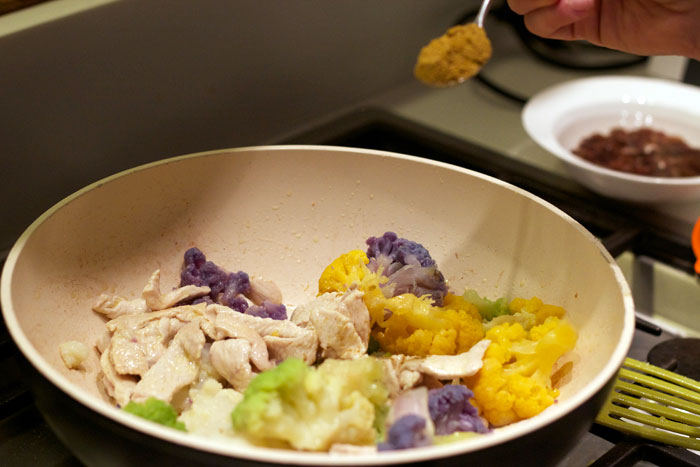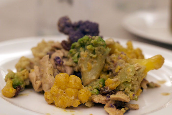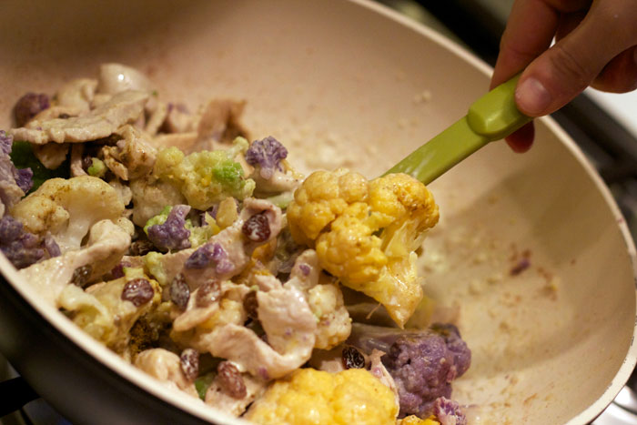Ingredienti: filetti di tacchino, cavolfiori colorati, latte di cocco (o panna), curry, olio evo, uvetta, pinoli, sale e pepe.