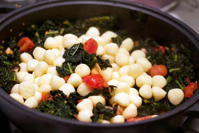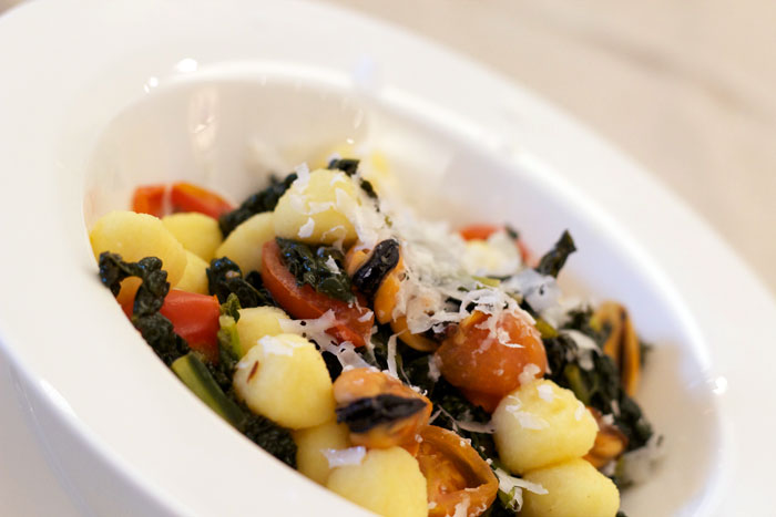 Ingredienti: gnocchetti di patate, cavolo nero, aglio, peperoncino, pomodorini, cozze, olio evo, sale e pecorino romano.