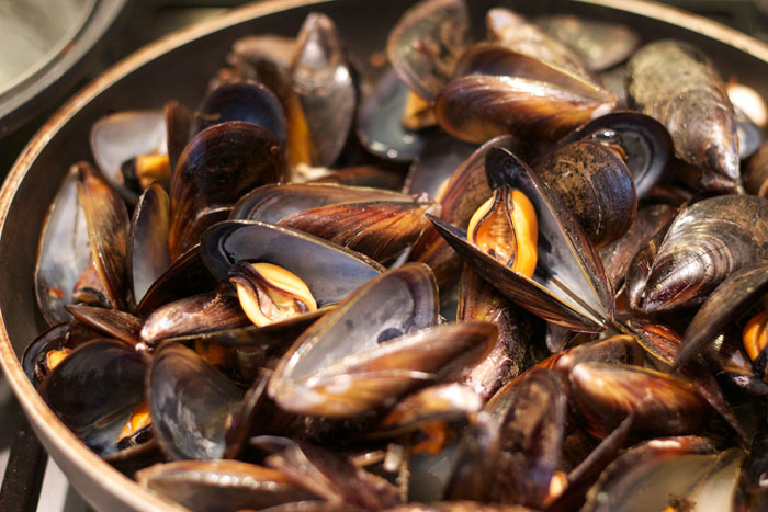 Procedimento: pulire bene il cavolo nero e tagliarlo a listarelle piuttosto sottili. Tagliare in 4 parti e lavare i pomodorini. Mettere in una padella uno spicchio di aglio con dell’olio e del peperoncino, aggiungere i pomodorini e il cavolo e lasciare stufare aggiungendo del sale. In un’altra padella mettere olio, aglio e peperoncino. Non appena caldo unire le cozze e lasciare cuocere. Togliere le cozze dai gusci e lasciare da parte. Filtrare il brodo delle cozze e tenere a portata di mano. Mettere l’acqua a bollire. Cuocere gli gnocchi e scolare bene. Unire nella padella con pomodorini e cavolo. Aggiungere un po’ di acqua filtrata delle cozze e terminare la cottura degli gnocchi. Unire le cozze e servire con una spolverata di pecorino romano grattugiato.