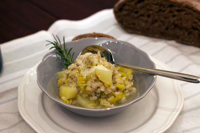 Ingredienti: 2 porri, 2 patate piccole, 200 gr. di orzo, brodo vegetale homemade, olio evo, sale, pepe nero.