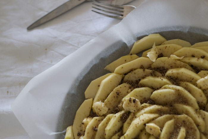 Ingredienti: 1 rotolo di pasta sfoglia, 100 gr. di burro morbido, 115 gr. di zucchero (di canna o muscovado), 4 mele sbucciate a spicchi sottili.
