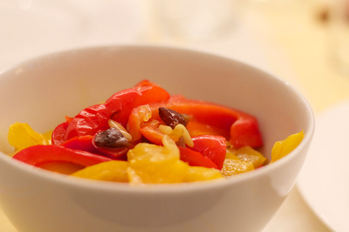 Procedimento: mettere in ammollo in acqua l’uvetta. Lavare e pulire bene i peperoni facendo attenzione di togliere le pellicine interne e i semi. Tagliare i peperoni a striscioline e la cipolla in anelli piuttosto sottili. In una padella far scaldare un filo di olio evo. Aggiungere la cipolla e lasciare stufare per qualche minuto a fiamma moderata. Unire i peperoni e far cuocere 3/4 minuti. Condire con sale, zucchero, una spruzzata di aceto e un paio di cucchiai di acqua. Aggiungere infine l’uvetta strizzata e i pinoli. Coprire il tutto e lasciare cuocere per 15 minuti.
