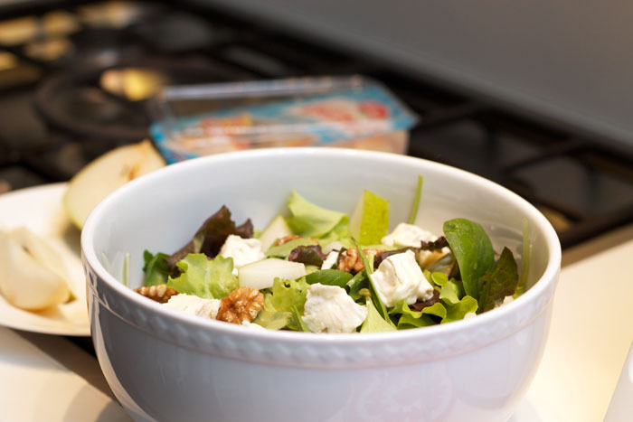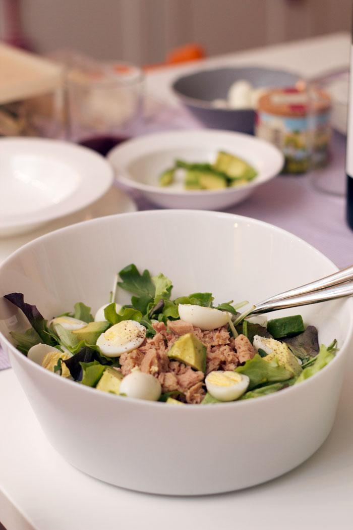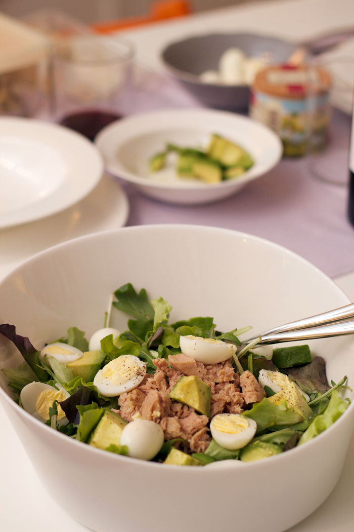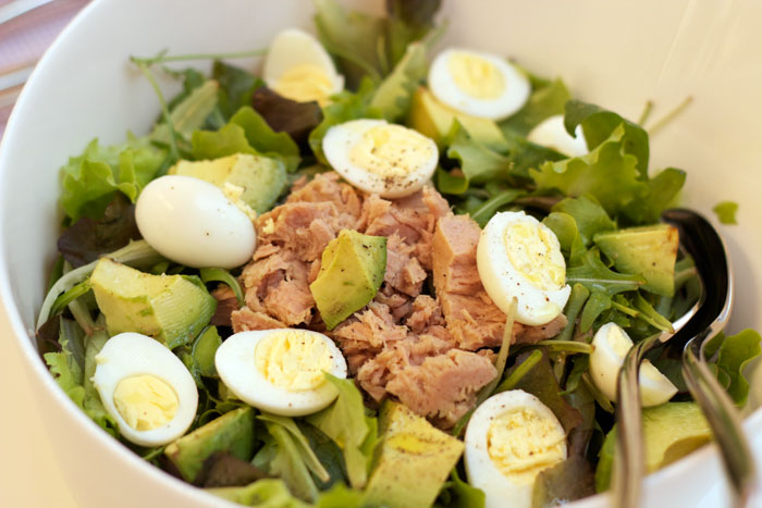 Ingredienti: insalata mista, uova di quaglia, avocado, tonno sott’olio, fior di sale, succo di limone, pepe, olio evo.