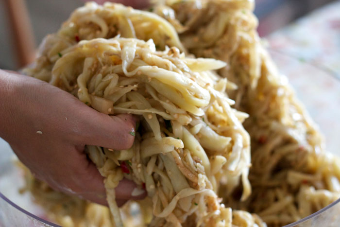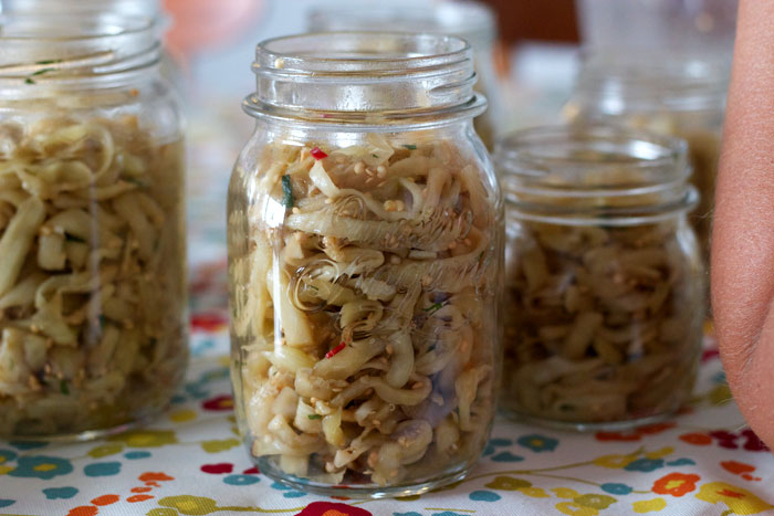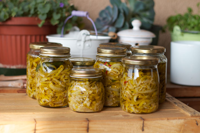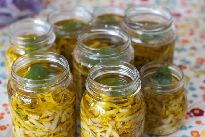 Procedimento: sbucciare le melanzane e tagliarle a fette di circa 5 mm. Ragliare le fette a listarelle. In una pentola capiente inserire le listarelle cospargendo di sale fino. Ogni due melanzane ci vorrà circa una manciata e mezza di sale. Coprire con uno straccio adagiandolo sulla pentola. Mettere un peso sulla penzola in modo che le melanzane siano ben premute e rilascino la loro acqua naturale. Lasciare riposare per almeno 12 ore. A questo punto sciacquare le melanzane e mettere a bollire una grossa pentola con all’interno acqua e aceto (2 parti di acqua e 1 di aceto) e un limone tagliato a metà. Appena l’acqua prenderà bollore, immergere le listarelle di melanzane e lasciare cuocere per circa 5 minuti (o comunque fino a quando non saranno diventate belle bianche). Scolare e lasciare raffreddare su un panno di cotone con l’accortezza di separarle le une dalle altre molto bene. Nel frattempo preparare un trito di menta, basilico, aglio e peperoncino. Quando le melanzane saranno ben fredde e asciutte devono essere unite al trito e girate molto bene in modo che i profumi possano spargersi bene su tutta la quantità delle melanzane. Sterilizzare tutti i vasetti e adagiare sul fondo una foglia di alloro. Riempire con le melanzane condite fino ad un centimetro e mezzo dal bordo in alto. Coprire le melanzane versando olio evo in abbondanza e lasciare raffreddare ancora. Le melanzane faranno delle bollicine che verranno in superficie. Smuovere leggermente i barattoli e poi chiudere con tappi nuovi ed ermetici. Lasciare un paio di settimane in luogo asciutto e buio. Su una fetta di buon pane sono divine.
