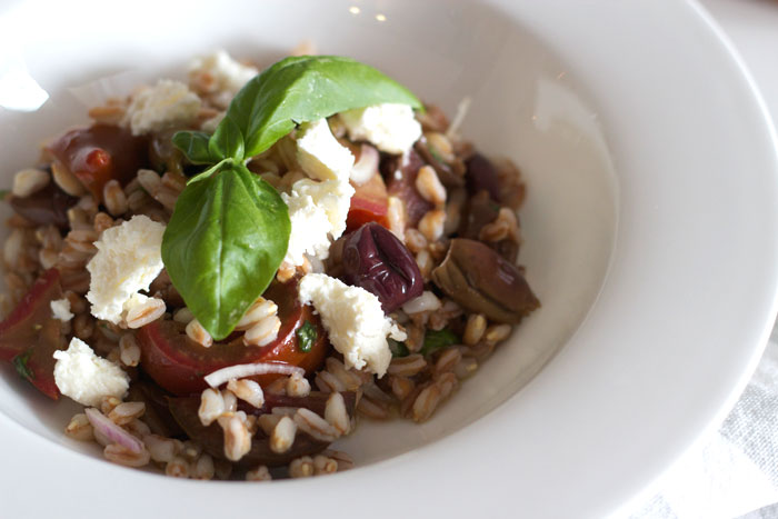 Ingredienti: farro, pomodori camone, basilico, olive taggiasche, caprino, cipollotto fresco,sale, pepe, olio evo.