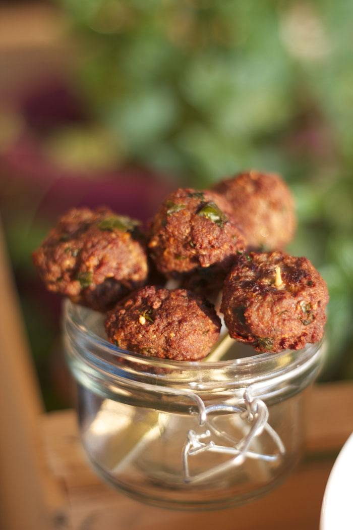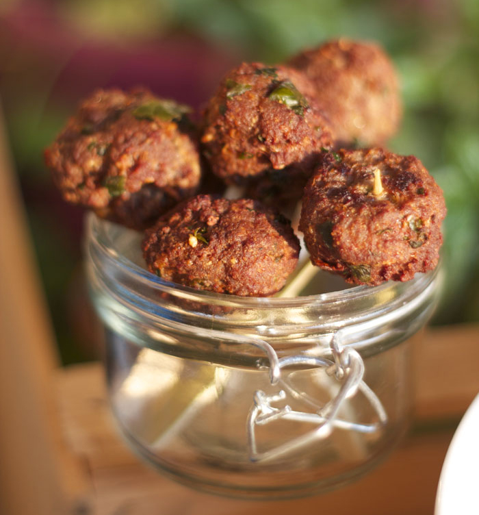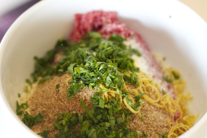 Ingredienti: 400 gr. di carne trita, 100 gr. di parmigiano reggiano, 50 gr. di pangrattato, 1 uovo e 1 tuorlo, scorza di 1 limone, sale, pepe, prezzemolo, aglio, olio per friggere.