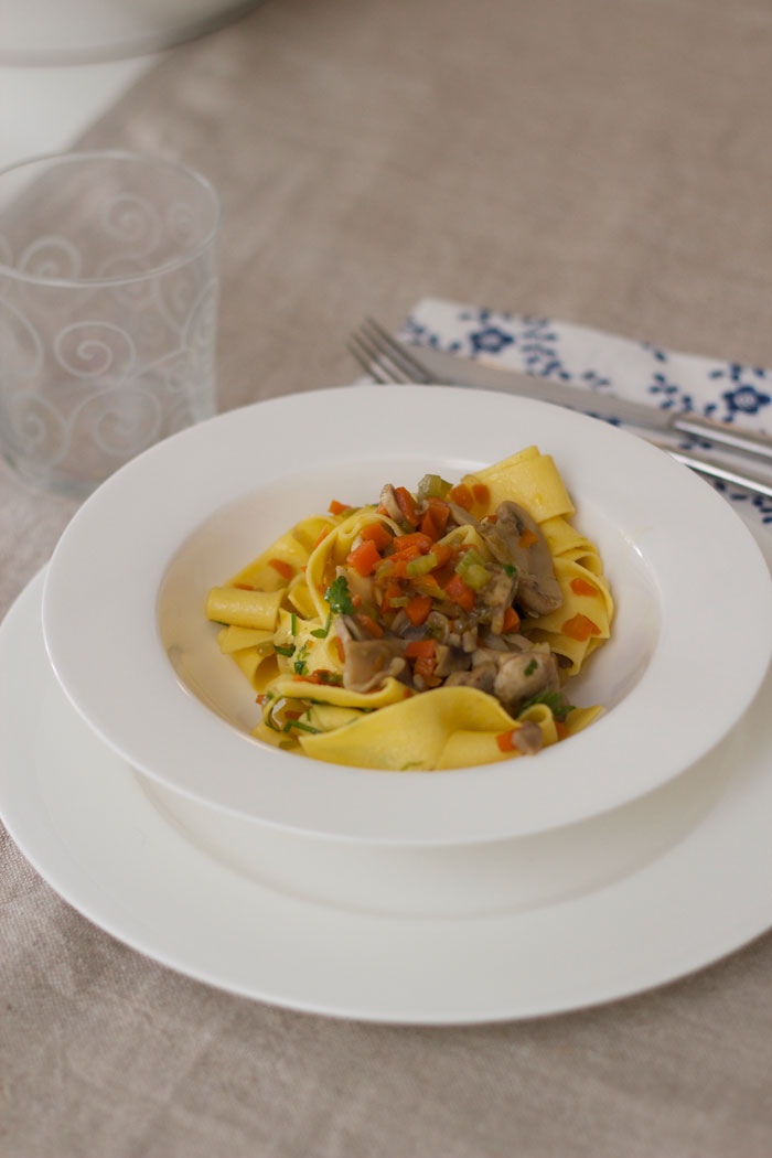 Ingredienti: pappardelle, sedano, carota, cipolla, funghi, dado home made, olio evo, sale, pepe, prezzemolo fresco.