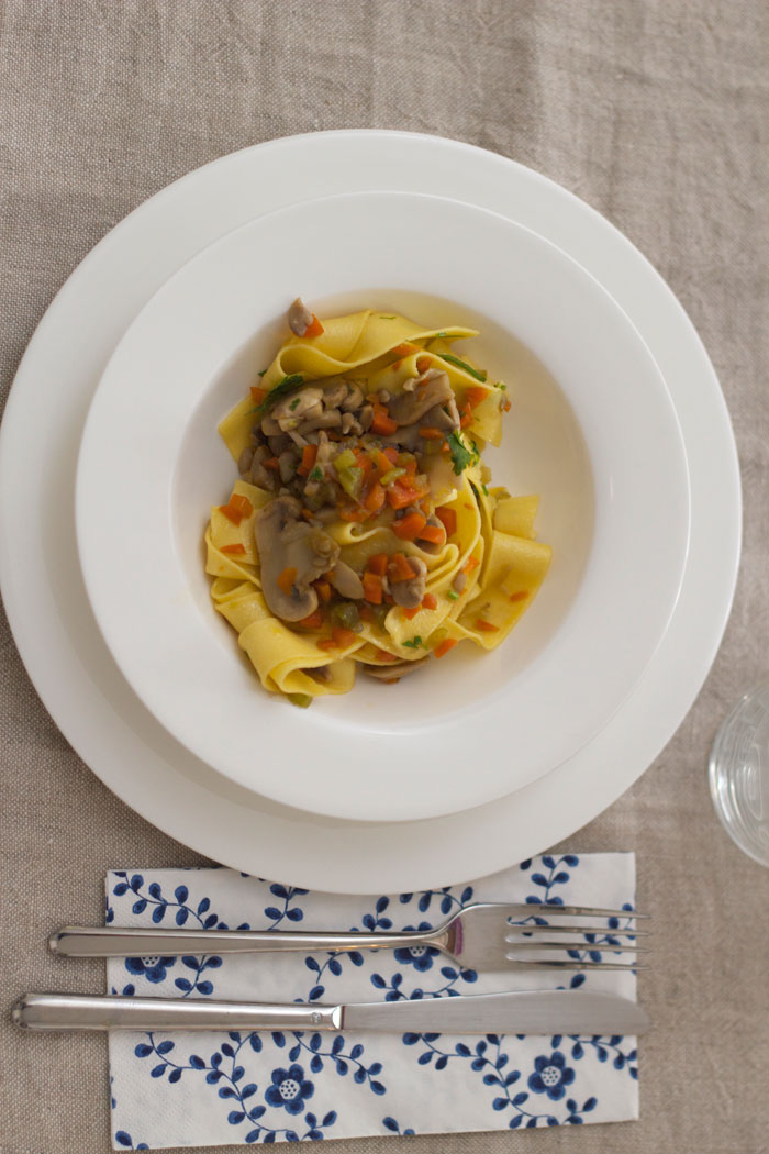 Domenica, per non perdere nemmeno un secondo del tempo guadagnato, ho fatto ribaltato la casa. Non ho finito di fate tutto quel che avrei voluto, ma ho alleggerito un pochino il guardaroba e ho messo in ordine un po’ di cose. Quando faccio queste cose provo sempre grande soddisfazione. Inizio una nuova stagione con il giusto passo, cercando di mettermi in sintonia con il mondo che mi circonda e quello che vorrei. Ho trascurato un po’ la cucina nel fine settimana ma non potevo fare altrimenti. Ho in programma una focaccia e una crostata da preparare. Le riserverò per una di queste sere quando, tornata dal lavoro, mi rifugio ai fornelli. Accendo poche luci, le candele e la musica. Lascio quindi che le cose vengano da sole….senza preoccuparmi troppo di quello che accade. Male che vada non mi ricorderò quanta farina ho usato o quante uova ho messo. Poco male….mi tornerà in mente. Buona settimana con….le mie pappardelle ai funghi: