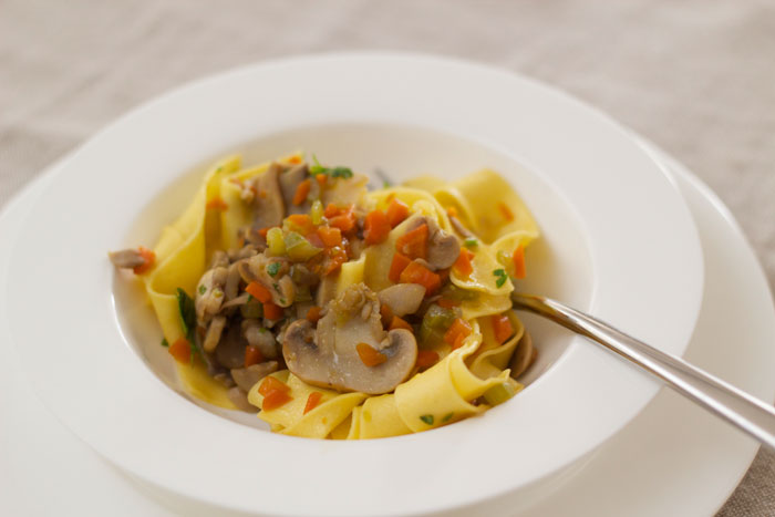 Procedimento: mettere a bollire una pentola con abbondante acqua salata. Fare un trito con sedano, carota e cipolla. Metterlo in una padella antiaderente e lasciar intiepidire. Aggiungere i funghi e un goccino di acqua. Insaporire con un cucchiaino di dado home made e lasciar cuocere per circa 10 minuti. Cuocere le pappardelle fresche per circa 1 minuto nell’acqua bollente e scolare. Unire alla padella con i funghi. Condire con olio evo e pepe e una manciata di prezzemolo fresco tritato.