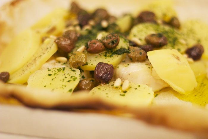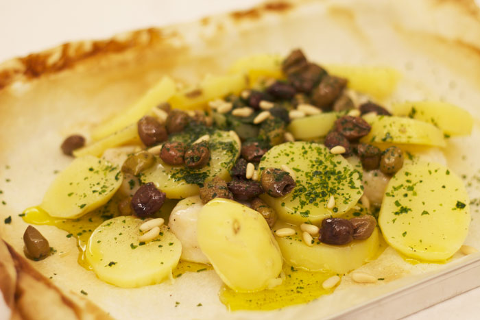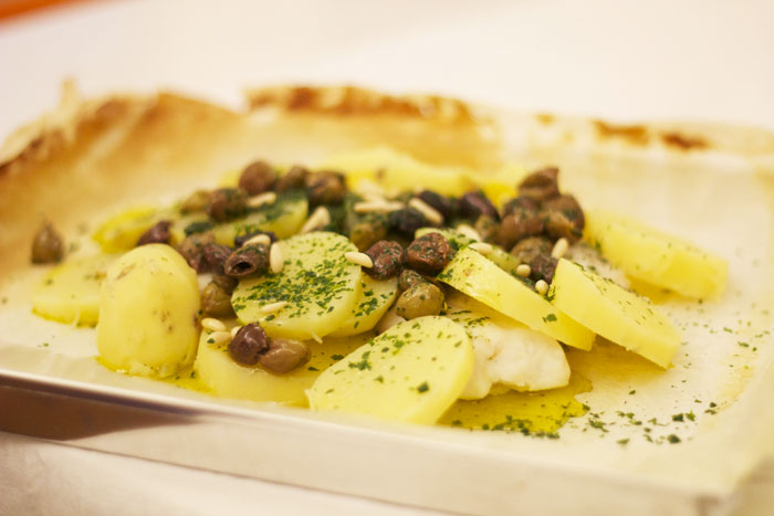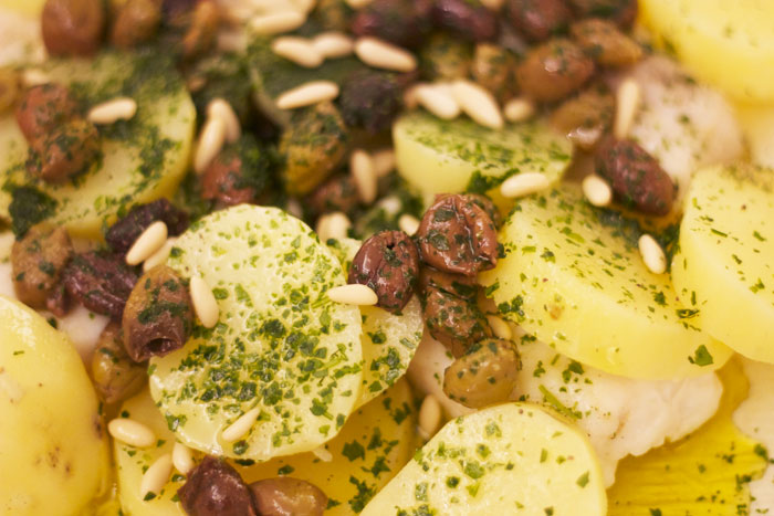 Ingredienti: filetti di merluzzo surgelato, patate, olive taggiasche, prezzemolo fresco, pinoli, sale, pepe, olio evo