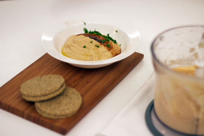 Procedimento: scolare i ceci mantenendo l’acqua di conservazione. Mettere in un mixer o un frullatore l’aglio, il succo di limone, il sale, il pepe, i ceci, l’olio evo e l’acqua di cottura dei ceci. Frullare per qualche minuto finchè non raggiungerà una densità liscia, omogenea e cremosa. Impiattare e decorare con paprika e coriandolo fresco tritato. Con cracker, grissini o crostini….it’s up to you!