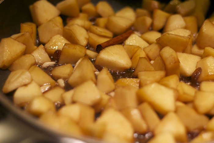 Ingredienti: 4 mele golden, 1 limone, 2 uova, 100 gr. di zucchero, pinoli e uvetta, un cucchiaio di lievito per dolci, 150 gr. di burro, 200 gr. di farina