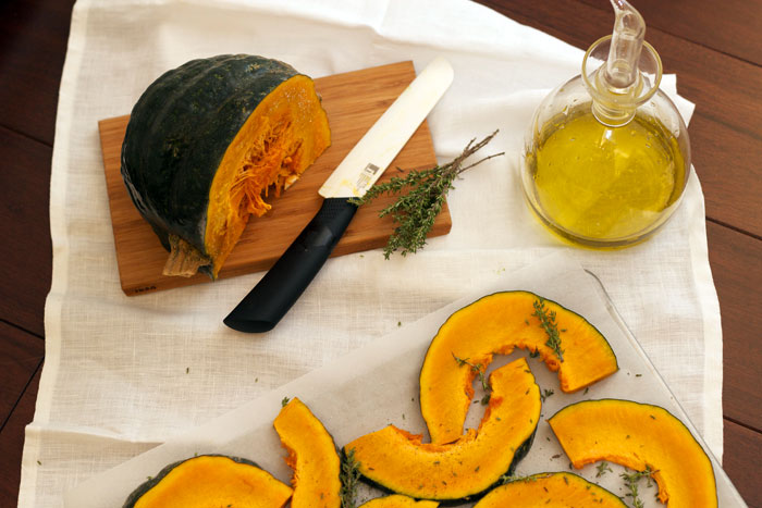 Ingredienti: zucca mantovana, sale, pepe, olio evo, rosmarino e timo (e salvia, eventualmente).